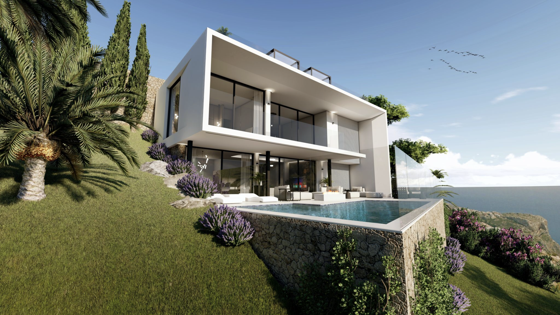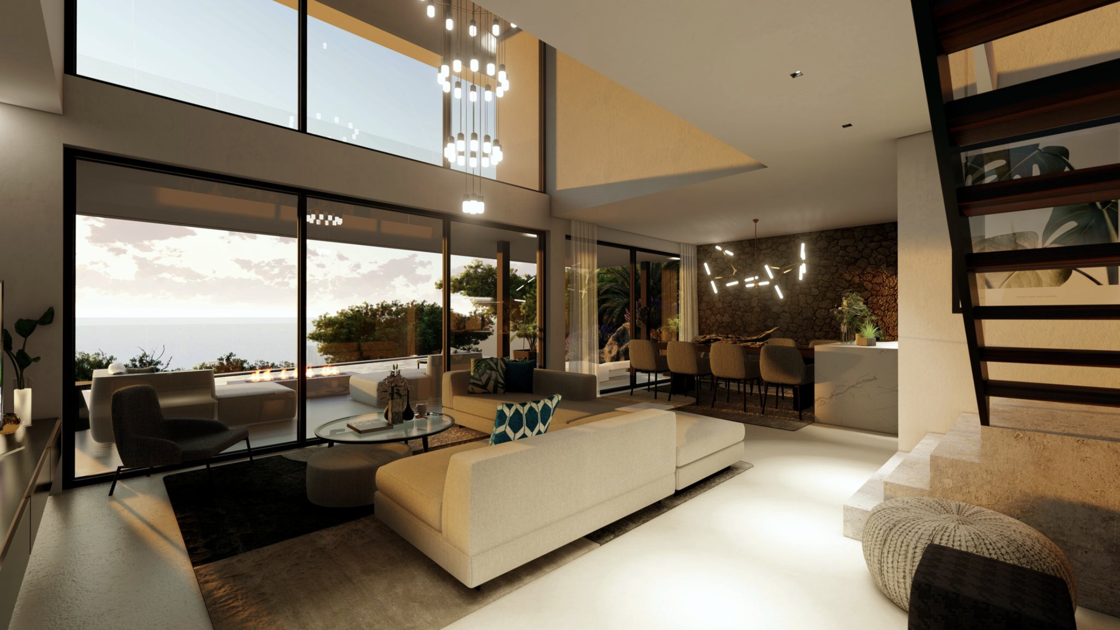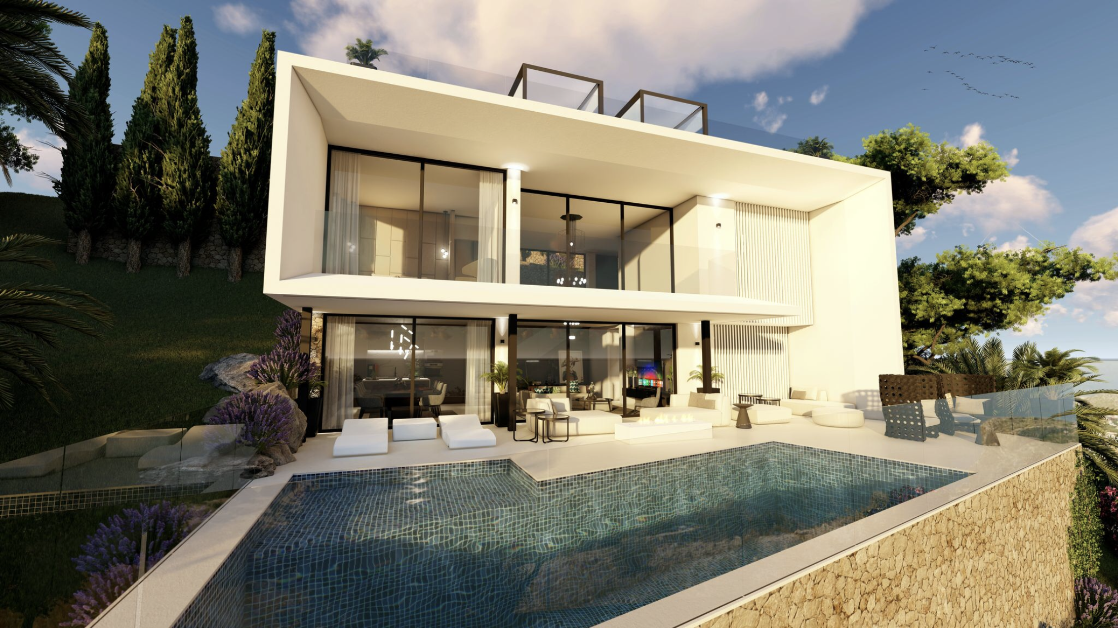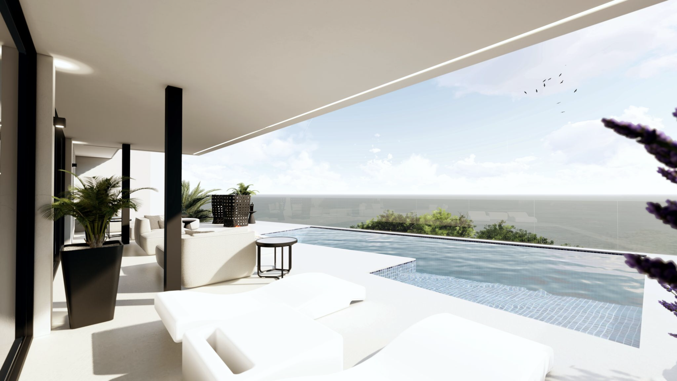 Luxe villa met 3 slaapkamers en 3 badkamers, totaal 210m2 bebouwde oppervlakte inclusief 48m2 overdekte terrassen. Deze prachtige 'witte' villa is fraai ontworpen voor een hellend perceel om te genieten van een spectaculair uitzicht. De villa is bereikbaar vanaf de straat via elektrische hekken die uitkomen op een parkeerplaats. Treden leiden naar de hoofdingang, een kleine hal en de trap naar de woonkamer. Vanaf hier heeft u toegang tot een van de grote gastenkamers op de eerste verdieping met ensuite badkamer, ingebouwde kasten en vloer-tot-plafond ramen. Een brug loopt over de dubbelhoge woonkamer naar de mastersuite, die een ensuite badkamer met dubbele wastafel, inloopkast en een privébalkon omvat. Het zwembad heeft een extra ondiep 'Playa'-gedeelte met glazen balustrades voor een maximaal panoramisch uitzicht.