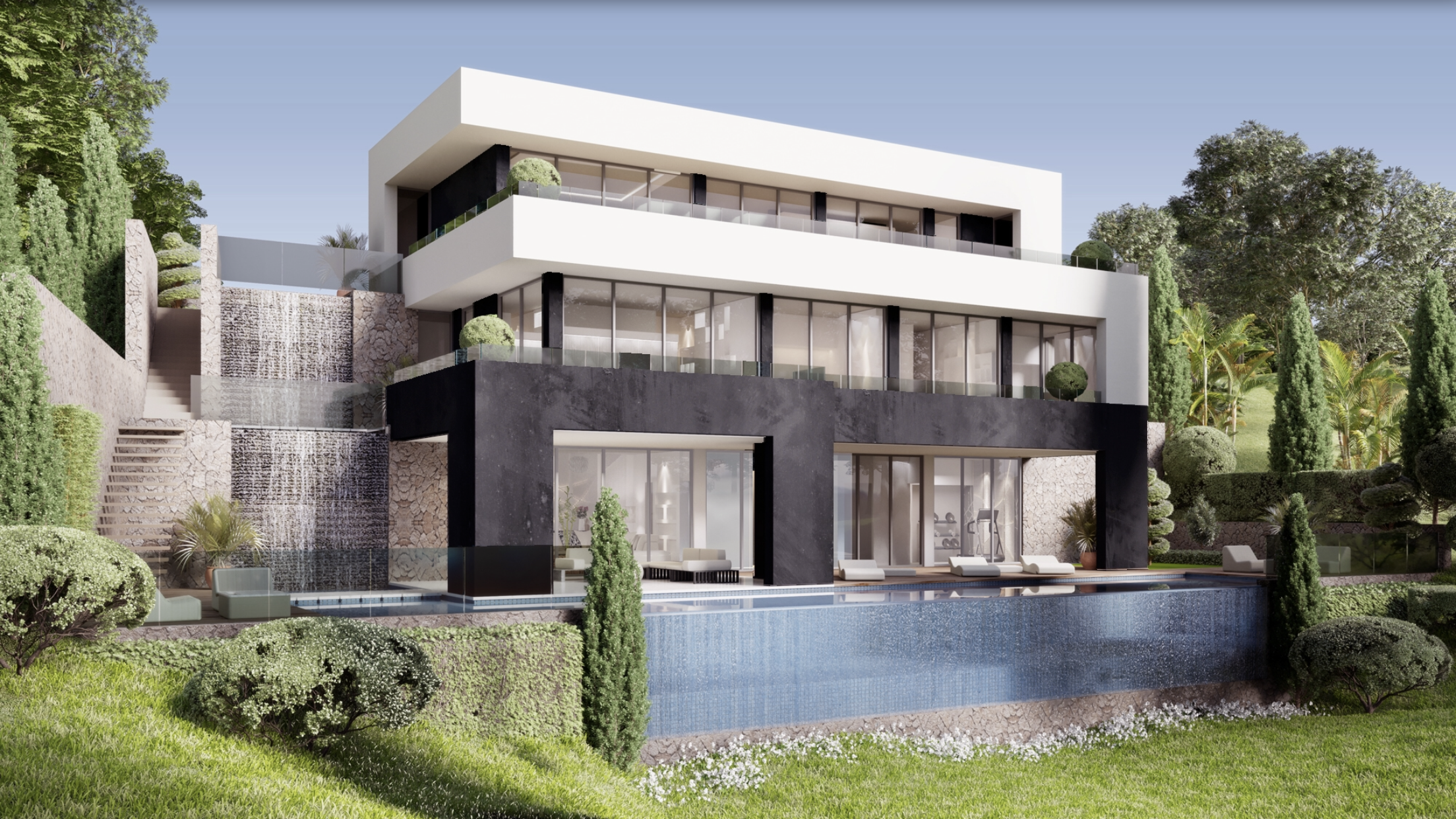Totale bebouwing 428m2 inclusief 119m2 overdekt terras, met 5 slaapkamers en 5 badkamers. Deze prachtige villa is ontworpen voor een steil perceel met de hoofdingang op het bovenste niveau. Een gastvrije hal leidt naar de woonkamer met volledig ingerichte keuken en eetruimte, allemaal met vloer-tot-plafond ramen die uitkomen op een gedeeltelijk overdekt terras. Treden leiden naar de slaapkamerverdieping waar alle 4 de slaapkamers ensuite voorzieningen, ingebouwde kasten en toegang tot het voorterras hebben. De begane grond herbergt een fantastische zomerlounge die uitkomt op een groot overdekt terras, jacuzzi, ondiep bad en een 17m x 3m overloopzwembad. De 5e slaapkamer is ontworpen met een sauna, spa en doucheruimte. Een kenmerkende watercascade stroomt van elke verdieping naar het prachtige zwembadgedeelte.
