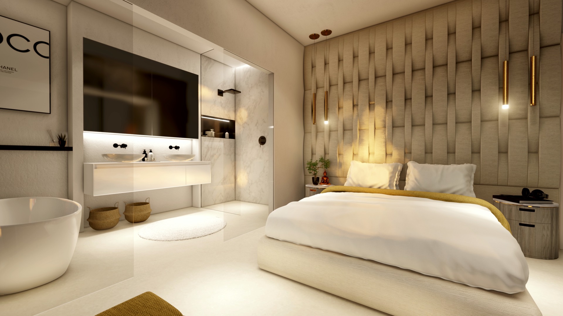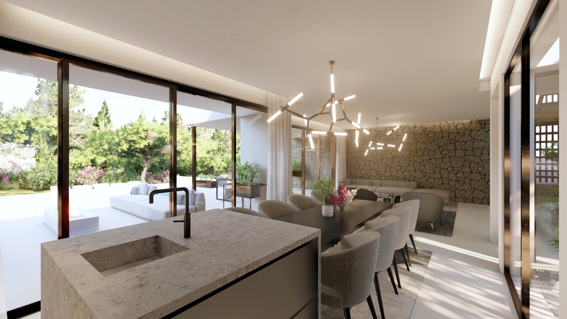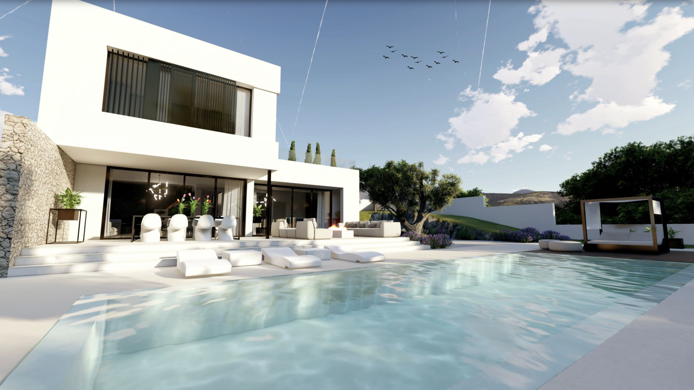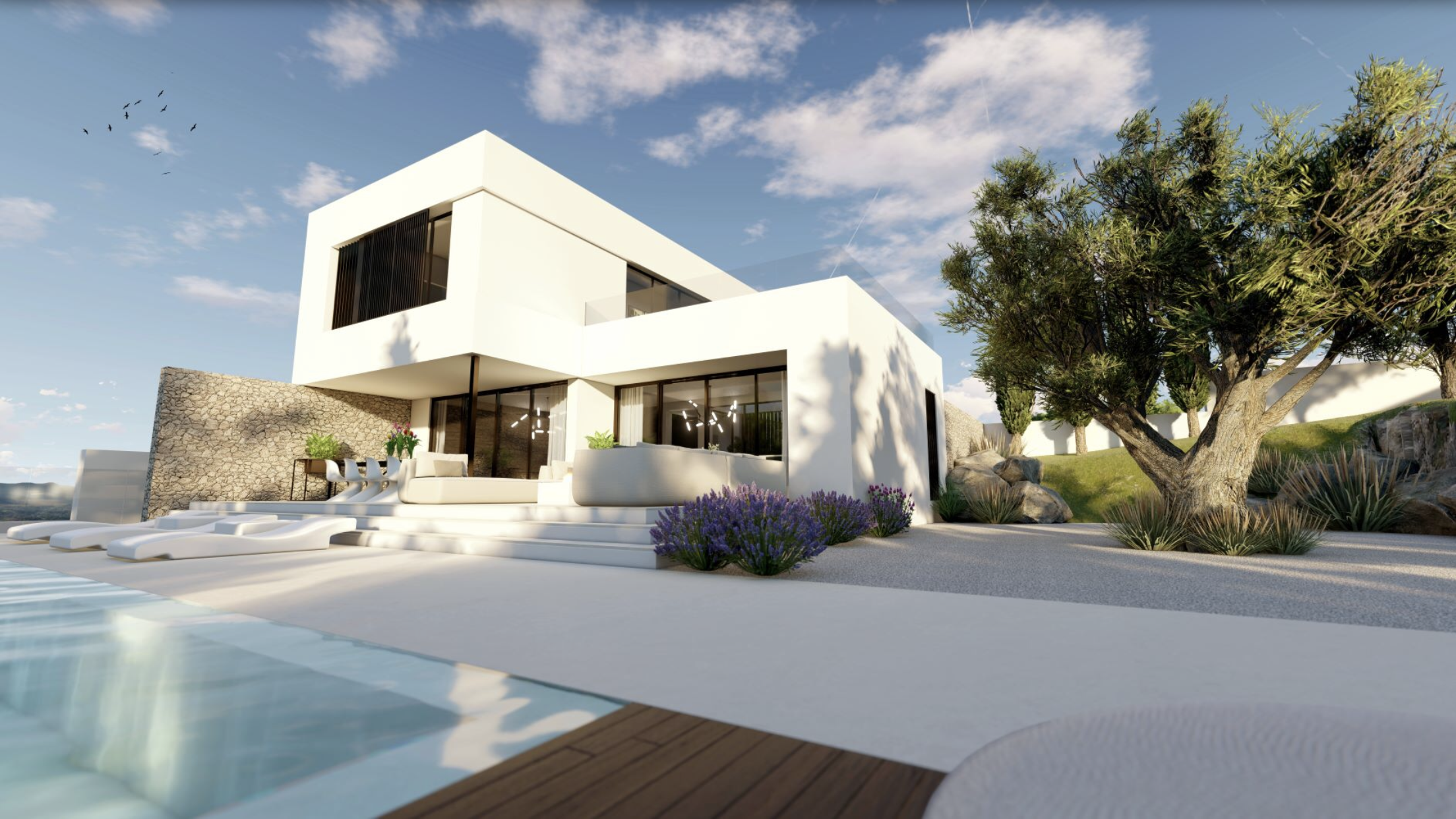 Een nieuwe hoogwaardige villa die op verschillende locaties langs de kustlijn of in het binnenland van Mallorca/Ibiza gebouwd kan worden. Deze villa van 214m2 (192m2 + 22m2 overdekte terrassen) heeft 4 slaapkamers en 4 badkamers, porseleinen vloeren door de gehele woning, LED-verlichting binnen en buiten, een kanaalsysteem voor airconditioning en verwarming, een designerkeuken met kookeiland en stenen werkblad. Er is een groot overdekt terras naast de woonkamer en nog een open terras op de eerste verdieping. Het zwembad is 12x4. Bijzondere kenmerken zijn onder meer ingebouwde kasten en ensuite badkamers voor alle slaapkamers, een glazen binnenplaats met een 100 jaar oude olijfboom zichtbaar vanuit de woonkamer, een open trap, suède behang bij de trap, natuurstenen muren binnen en buiten en overal ingebouwde verlichting. Automatisch hek en video-intercomsysteem zijn standaard aanwezig.