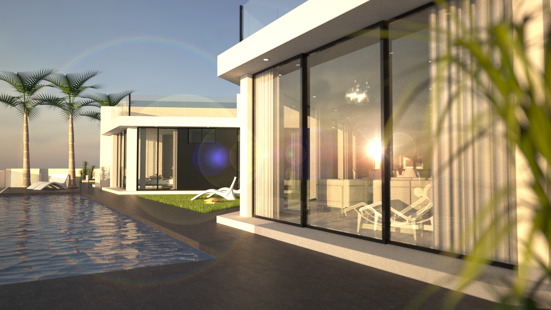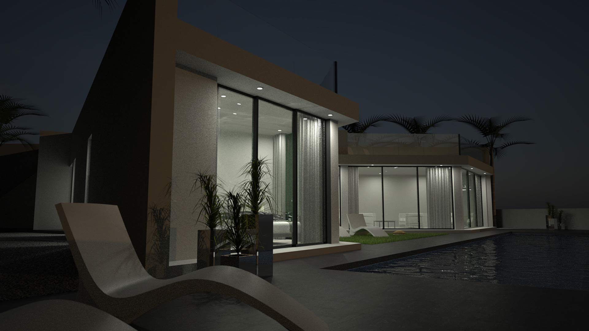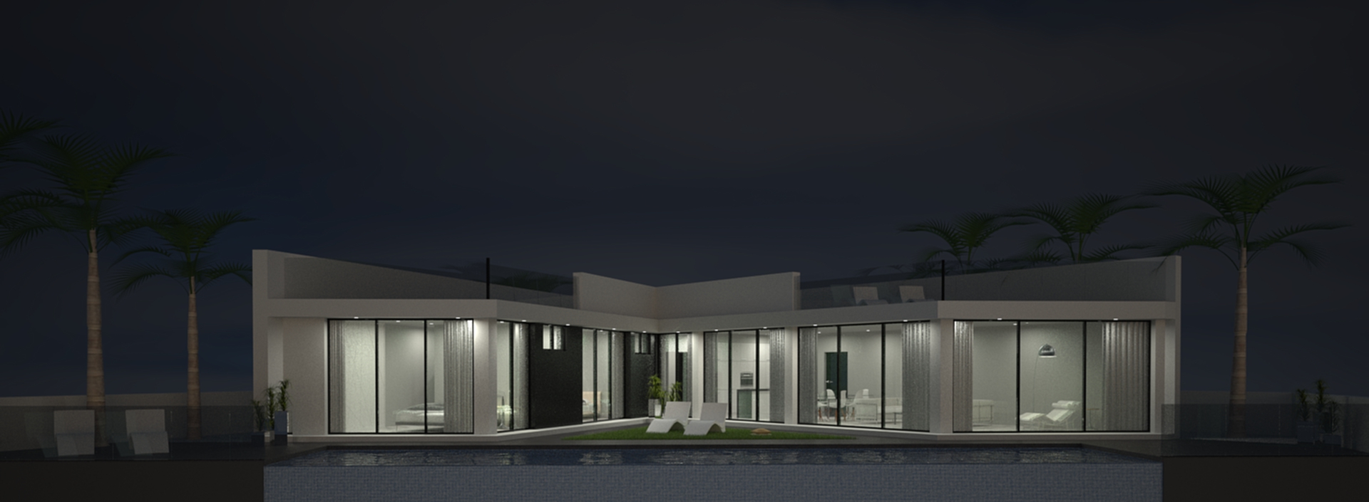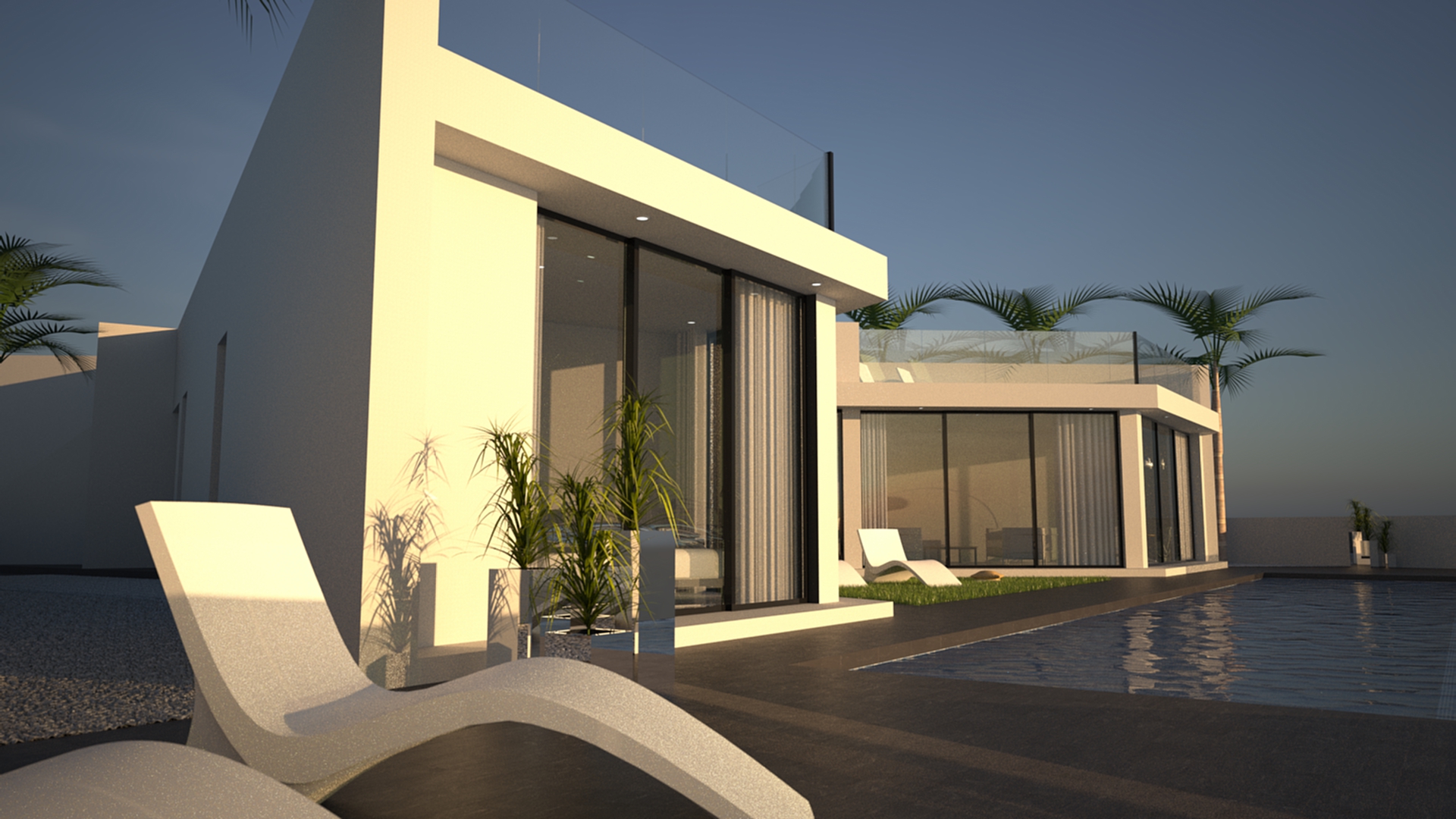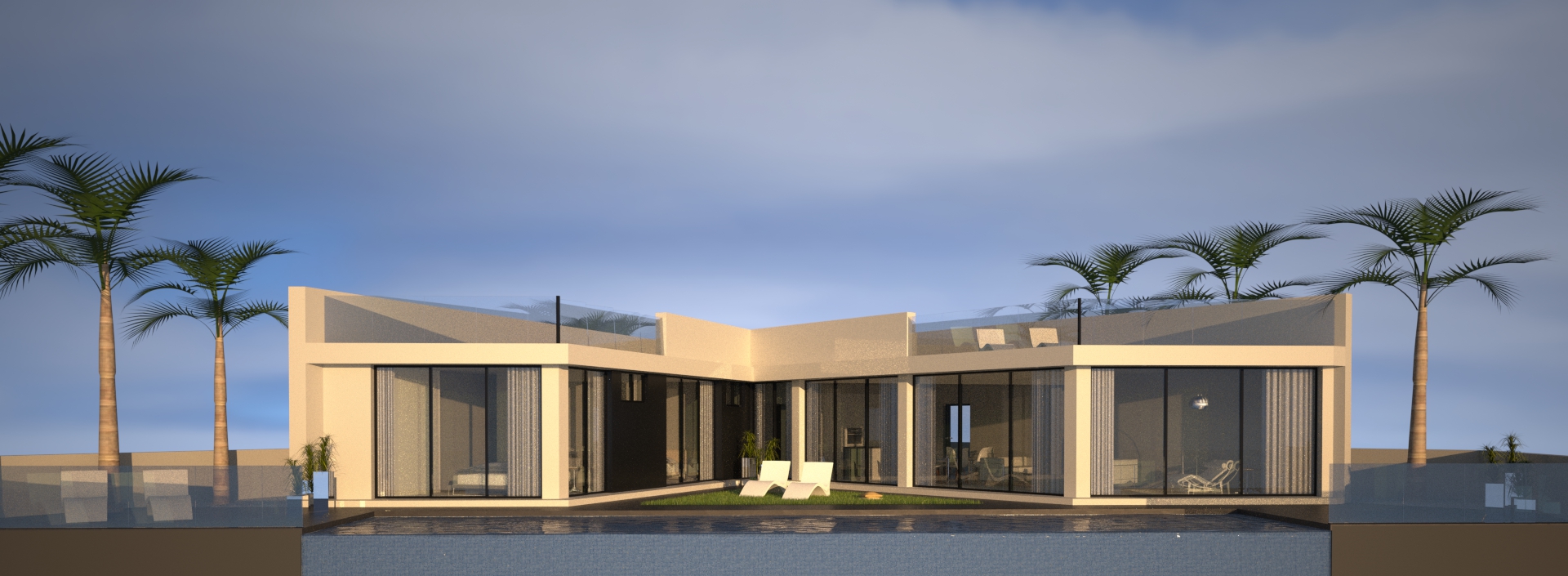 Deze villa van 149m2 beschikt over een luxe open keuken met alle geïntegreerde elektrische apparatuur, een kanaalsysteem voor airconditioning door de gehele woning, ingebouwde kasten in de slaapkamers en een glazen balustrade op het 110m2 grote dakterras voor de beste uitzichten in de omgeving. Binnen hebben we een woonkamer met schuiframen over de volledige breedte van de woonkeuken met directe toegang tot het terras en het 16x4 meter grote overloopzwembad. Het solarium is bereikbaar via de achterkant. Aan de andere kant van de villa zijn alle slaapkamers op een rij, ook met directe toegang tot het terras en het zwembad. Daarnaast is er een garage op de begane grond.