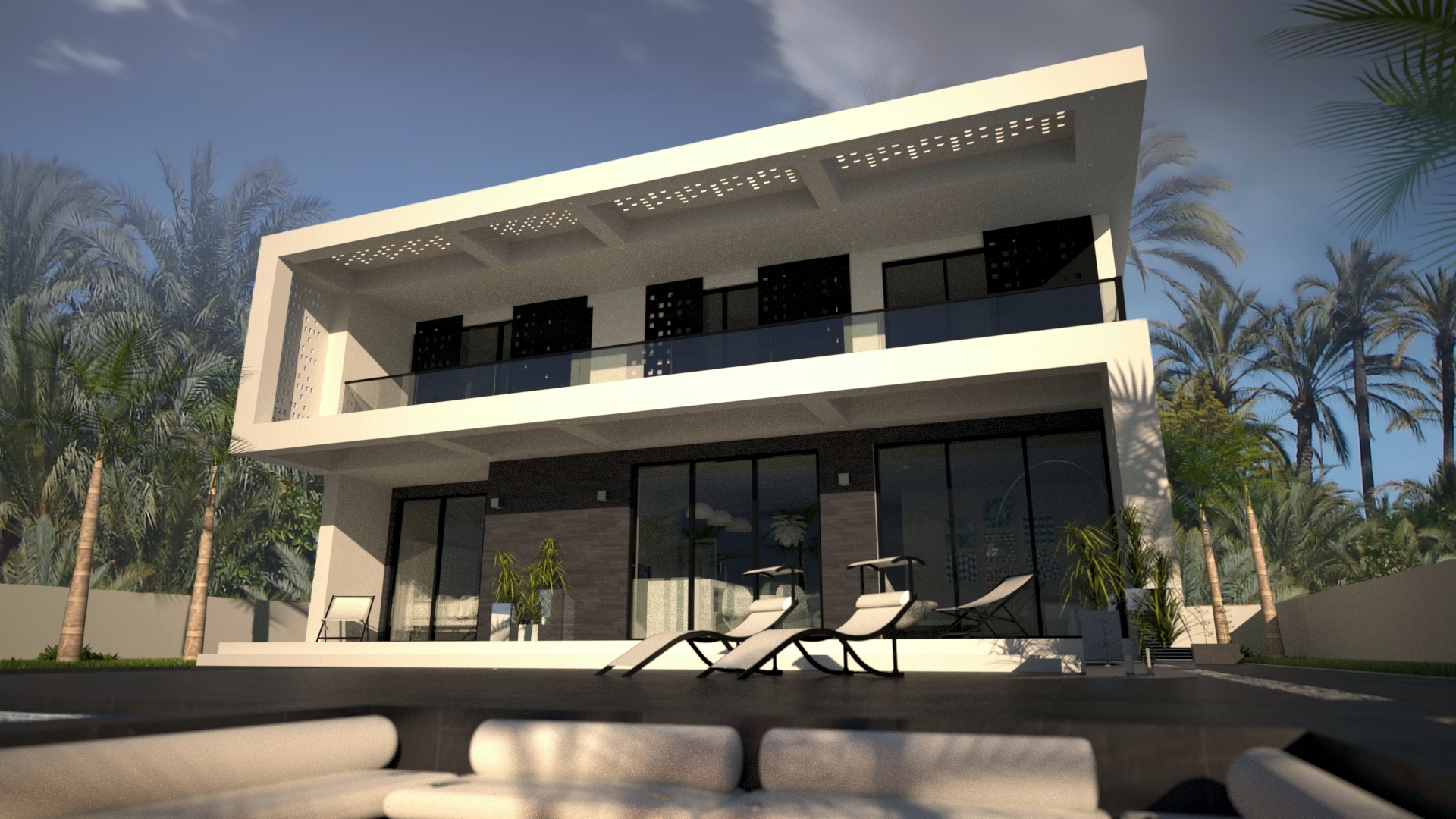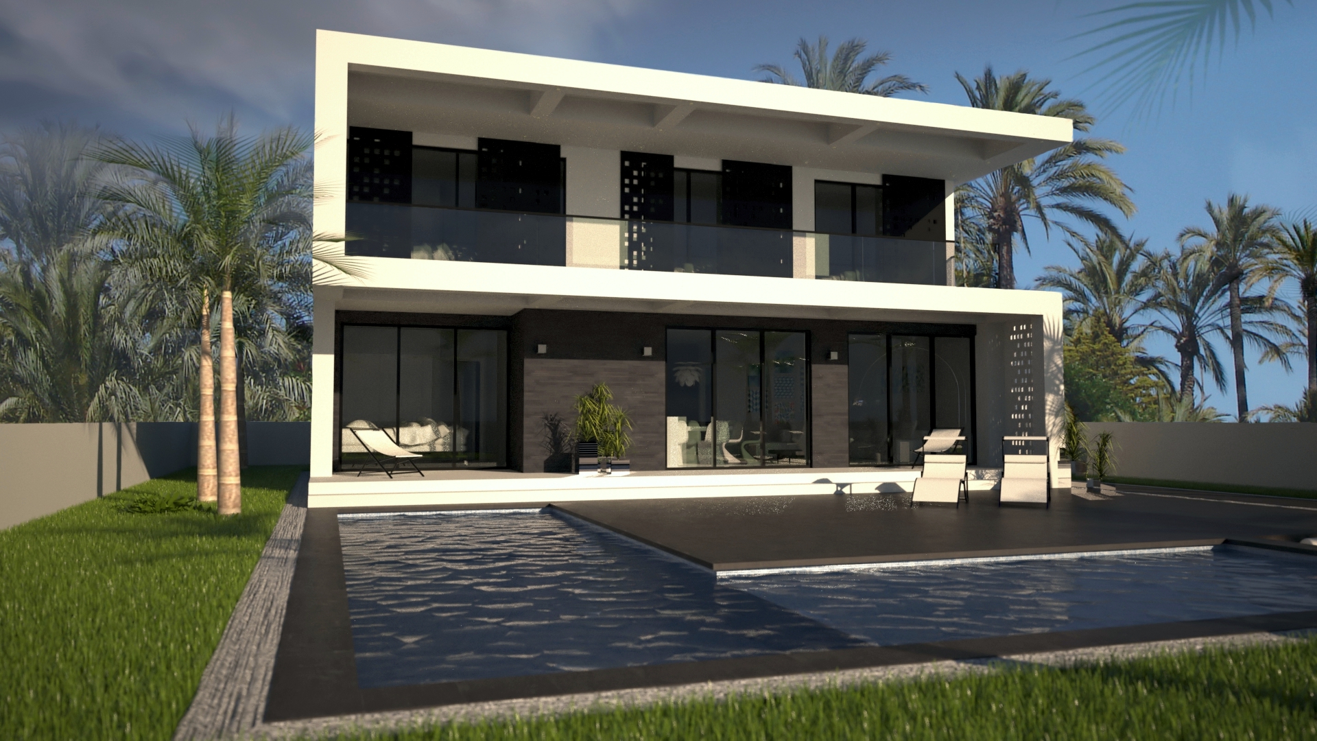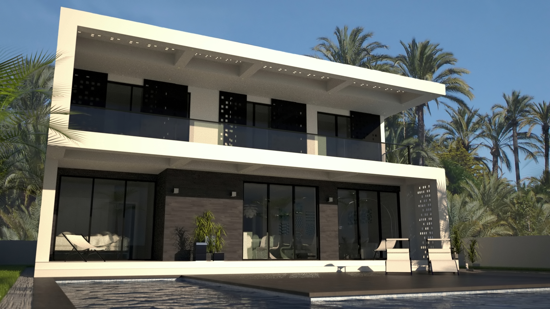 Dit is een modern, eigentijds vrijstaand ontwerp van 160m2 op 2 verdiepingen met een groot buitenterras, een overdekt woonterras van 19m2 en een balkon op de eerste verdieping. Op de begane grond bevindt zich een logeerkamer die uitkijkt op het zwembad, een toilet/badkamer beneden en een grote open woonruimte met volledig ingerichte keuken die uitkomt op een overdekt terrasgedeelte. Dit overdekte terras loopt af naar het zwembadterras met een groot zwembad, een ondiep bad en een verzonken vuurplaats. Een trap leidt naar boven naar de galerij met directe toegang tot drie slaapkamers, waarvan twee met ensuite, en een grote gezinsbadkamer. Alle drie de slaapkamers komen uit op het overdekte balkon op de eerste verdieping dat zich over de volledige lengte van de gevel uitstrekt.