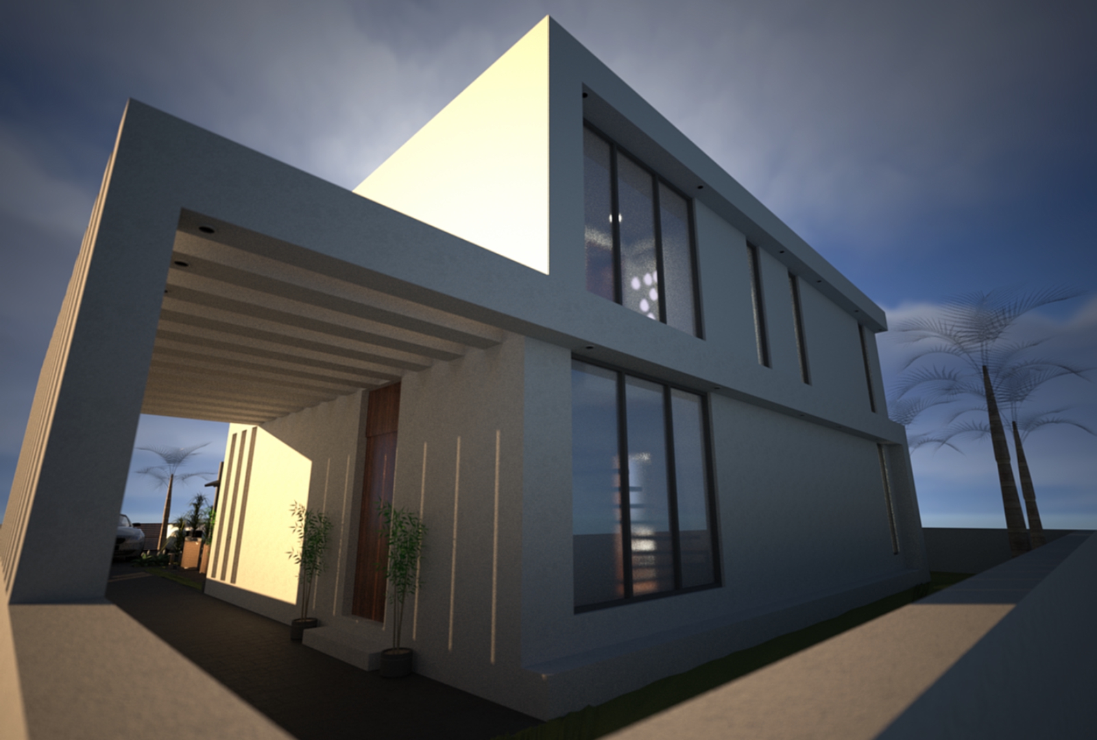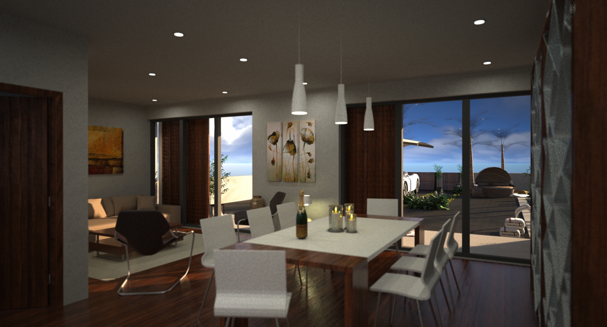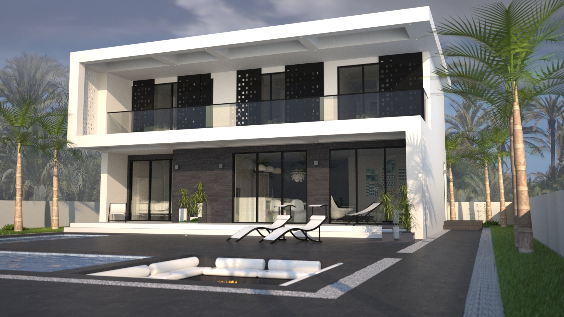 Dit is een modern, eigentijds vrijstaand ontwerp van 160m2 op 2 verdiepingen met een groot buitenterras, een overdekt woonterras van 19m2 en een balkon op de eerste verdieping. Op de begane grond bevindt zich een logeerkamer die uitkijkt op het zwembad, een toilet/badkamer beneden en een grote open woonruimte met volledig ingerichte keuken die uitkomt op een overdekt terrasgedeelte. Dit overdekte terras loopt af naar het zwembadterras met een groot zwembad, een ondiep bad en een verzonken vuurplaats. Een trap leidt naar boven naar de galerij met directe toegang tot drie slaapkamers, waarvan twee met ensuite, en een grote gezinsbadkamer. Alle drie de slaapkamers komen uit op het overdekte balkon op de eerste verdieping dat zich over de volledige lengte van de gevel uitstrekt.