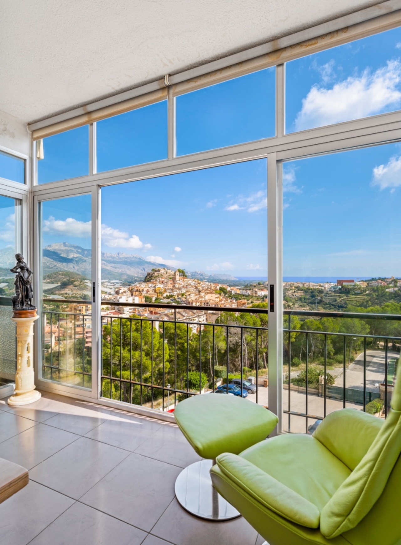 Licht, rust en eindeloze mediterrane uitzichten. Dit zonnige appartement op de 5e verdieping biedt een prachtig panoramisch zicht op de zee, de bergen en het charmante dorpje Polop. Geniet van lange ochtenden op het terras en warme avonden met een zachte zeebries.