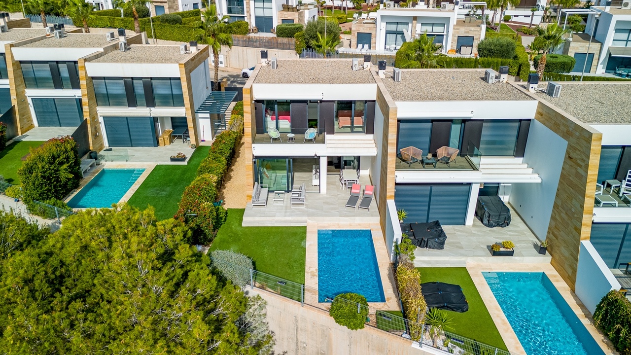 Luxe villa met panoramisch zeezicht en groene omgeving in Los Dolses Ontdek deze prachtige, zuidgerichte villa uit 2018 — een perfecte combinatie van stijl, comfort en luxe, gelegen op een royaal perceel van 304 m² met een woonoppervlakte van 126 m². Hier geniet u van adembenemend zeezicht, omringd door rust en natuur, en toch vlak bij bars, restaurants, apotheek en supermarkten. De villa beschikt over drie ruime slaapkamers en drie moderne badkamers, ideaal voor wie houdt van ruimte en elegantie. De lichte, open leefruimte sluit naadloos aan op de eetkamer en de moderne open keuken, volledig uitgerust met hoogwaardige materialen en slimme opbergruimte. Grote raampartijen zorgen voor overvloedig natuurlijk licht en creëren een harmonieuze overgang tussen binnen en buiten. De woning wordt volledig gemeubileerd verkocht. Voor optimaal comfort is de villa voorzien van gecentraliseerde airconditioning, elektrische zonneschermen, instapklaar en uitstekend onderhouden. Buiten wacht een verwarmd privézwembad met ruim zonneterras, waar u het hele jaar door kunt ontspannen en genieten van het uitzicht op zee. Op het eigen terrein is een parkeerplaats voorzien voor extra gemak en veiligheid. Gelegen in het populaire Los Dolses, op wandelafstand van alle voorzieningen, is dit de ideale woning voor wie op zoek is naar luxe, ruimte en een toplocatie aan de Costa Blanca. Gemeenschapskosten (VvE): €500/jaarOnroerendgoedbelasting (SUMA): €450/jaar Interesse of wilt u een bezichtiging plannen? Neem vandaag nog contact met ons op — deze villa zal u meteen overtuigen!