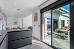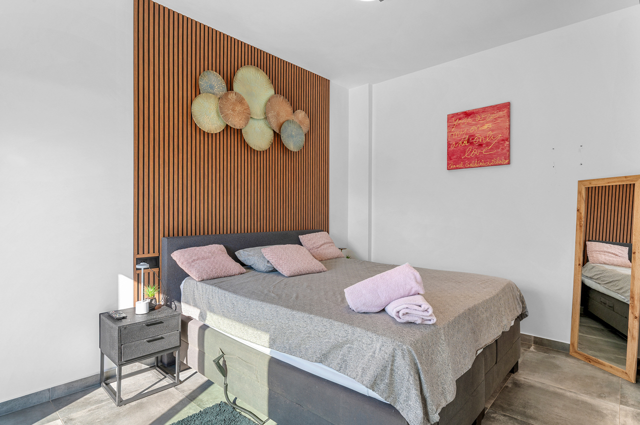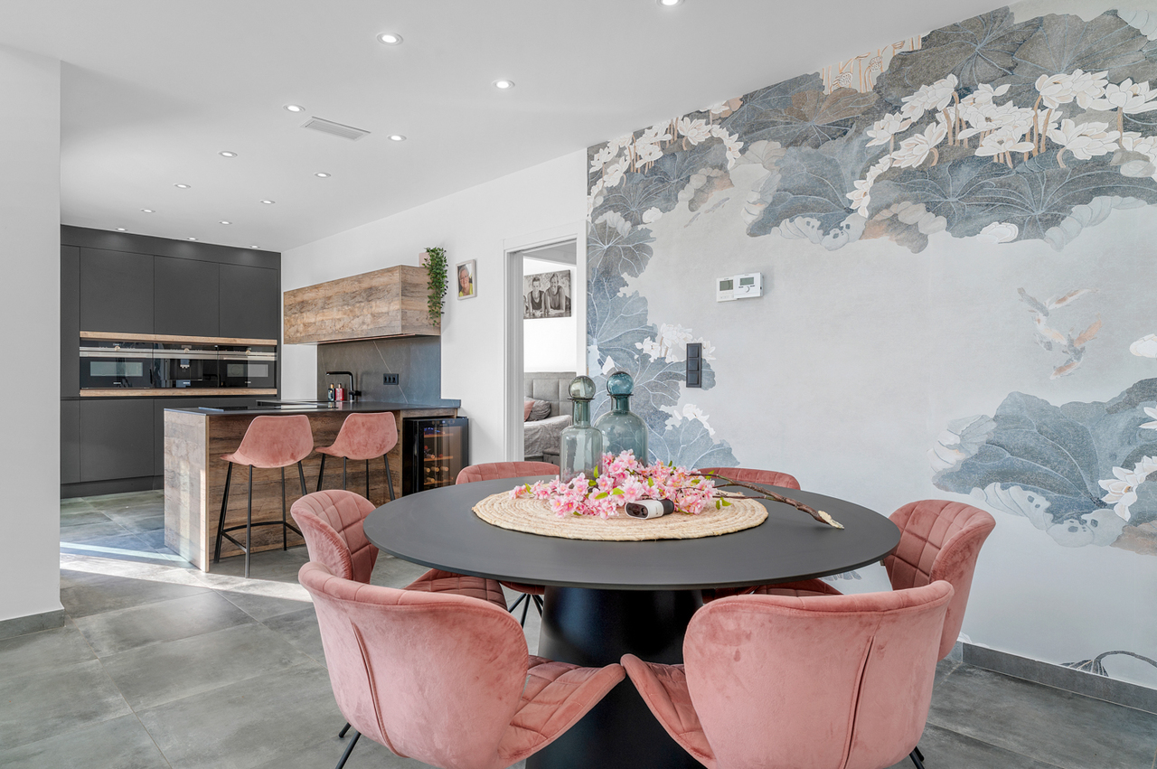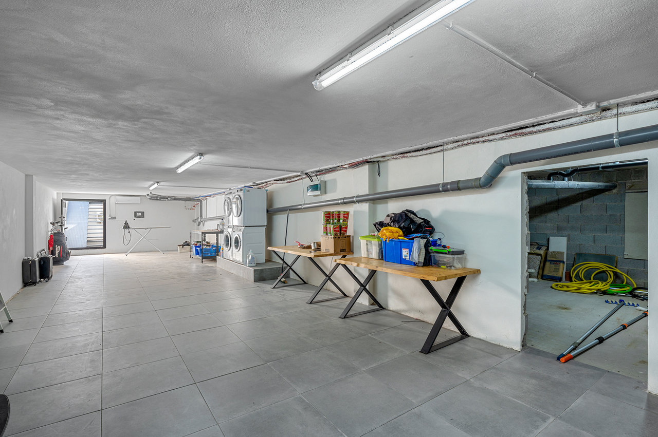 De woning bestaat uit een ruime gezellige woon-/eetkamer, een moderne open en volledig uitgeruste keuken (Siemens keukenapparatuur), twee slaapkamers met inloopkasten, twee badkamers, airconditioning (koeling/verwarming) voorzien in de gehele woning, vloerverwarming in de gehele woning, een groot terras/tuin met een pergola, een barbecue en een gezellige jacuzzi, een privé (verwarmd) zwembad, zonnepanelen (12), een grote kelder en een oprit met parkeerplaats en met een elektrische toegangspoort.