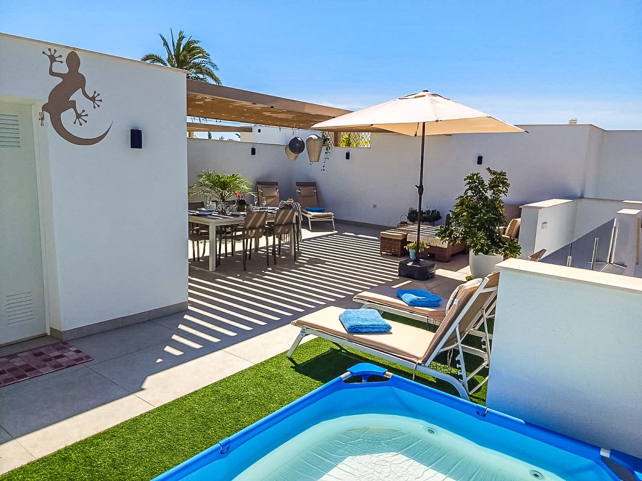 Wij zijn verheugd om u dit uitzonderlijk mooie penthouse in San Pedro del Pinatar, Murcia te presenteren. Dit moderne bungalowappartement op de bovenste verdieping staat garant voor een luxueuze en zorgeloze levensstijl. Gelegen in een charmant kustplaatsje en op korte wandelafstand van alle essentials – zoals Consum, de wekelijkse versmarkt en het gezellige stadscentrum – geniet u hier van een absolute toplocatie waar comfort en gemak samenkomen. Uniek in zijn soort Wat dit penthouse écht onderscheidt van andere woningen in het complex, is de hoogwaardige afwerking, de aandacht voor detail én de vele exclusieve extra’s. Bovendien beschikt deze woning als enige over een privétrap naar het solarium, wat zorgt voor maximale privacy en comfort. Bij het binnenkomen valt meteen de open, luchtige indeling op. Grote volledig inschuifbare ramen verdwijnen in de muur, waardoor binnen en buiten naadloos in elkaar overvloeien en de leefruimte baadt in natuurlijk licht. Overal zijn vliegramen voorzien, wat een groot pluspunt is voor dagelijks gebruik. Indeling en voorzieningen Het penthouse beschikt over drie ruime slaapkamers (goed voor 7 slaapplaatsen, ideaal voor verhuur!) en twee moderne badkamers met vloerverwarming, inloopdouche en kwalitatief sanitair. In alle slaapkamers vindt u ingebouwde kasten, TV-aansluitingen en rolluiken voor extra comfort en privacy. De keuken werd volledig anders ontworpen dan de standaardindelingen in het complex: een kookeiland dat doorloopt in een eettafel, hoogwaardige apparatuur (vaatwasser, kookplaat, koelkast, oven, microgolf, dampkap, wijnkast), voldoende bergruimte door maatwerk kasten. De woning is volledig voorzien van airconditioning, zowel in de leefruimte als in de slaapkamers. Privé solarium – uw eigen luxe oase Het ruime solarium van maar liefst 84 m² wordt volledig privé ontsloten via uw eigen trap, volledig uit het zicht van de buren. Hier vindt u: een volledig uitgeruste buitenkeuken met koelkast, kookplaat, grillplaat en automatische rolluik, ingebouwde zonnewering met geïntegreerde LED-spots, inbouwmuziekboxen in de muur, voorbereiding voor aansluiting van een jacuzzi, panoramisch uitzicht op een groen parkje dat nooit bebouwd mag worden, wat blijvende privacy garandeert. Extra troeven Toldo geplaatst op het kleine terras Gemeenschappelijk zwembad (verwarmbaar) Ruime aparte berging met boiler, aansluiting wasmachine/droogkast én extra gastentoilet Parkeerplaats inbegrepen Slechts 2 jaar oud → profiteer van slechts 8% belasting i.p.v. 10% Complex van slechts ±22 appartementen Geen inkijk, rustige ligging Optioneel meubilair De woning kan volledig gemeubileerd worden aangekocht en ook de fietsenberging is optioneel. Bent u op zoek naar een instapklare vakantiewoning, een comfortabel permanent verblijf of een uitstekende investeringsmogelijkheid met sterk verhuurpotentieel? Dan is dit penthouse dé perfecte keuze.Plan vandaag nog uw bezoek en ontdek zelf alle luxe die deze woning te bieden heeft.