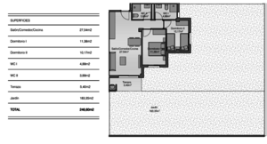 De woning wordt volledig gemeubileerd verkocht en bestaat uit een lichte woon-/eetkamer, een volledig uitgeruste open keuken, twee slaapkamers met inbouwkasten, twee badkamers met vloerverwarming en een zonnig zuidgericht terras en een enorme tuin.