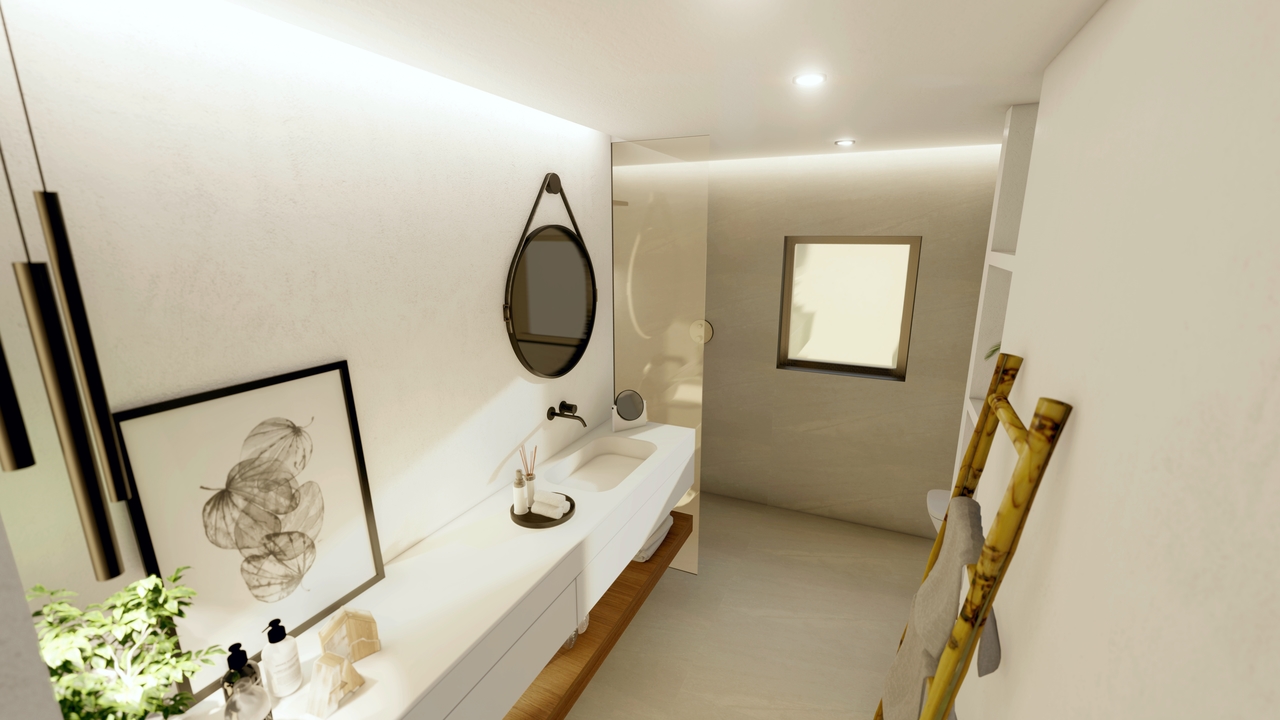 Dit is een zeer indrukwekkende villa waar natuurlijke elementen zowel binnen als buiten zijn toegepast, waardoor de buitenlucht naar binnen wordt gehaald! Natuurlijke beplanting en betonnen tegels verwelkomen u bij de voordeur van de villa, die leidt naar de entreehal met de trap en één van de vier slaapkamers. Deze slaapkamer heeft een eigen en-suite badkamer, een inloopkast en kamerhoge ramen die uitkomen op een overdekt terras met toegang tot het zwembad. Vanuit de hal bereikt u de woonkamer met een ruime keuken voorzien van een complete wand met keukenkasten en een extra rij onderkasten met een ontbijtbar. Deze ruimte is ontworpen om te dineren naast de keuken en heeft grote ramen die uitkomen op een schaduwrijk terras met een natuurstenen muur. De woonkamer is zo ontworpen dat deze uitkomt op een overdekt terras met houten balken en eveneens natuurstenen muren, dat dienst kan doen als een ontspannen buitenlounge met dezelfde vloer. Het zwembad is voorzien van een 10 meter lange verzonken zitbank, een groot open terras om te zonnebaden en een buitendouche van lokaal gewonnen steen, passend bij het thema van de villa en de onderhoudsvriendelijke tuinen.
