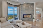 Binnen biedt de villa een lichte en ruime leefomgeving met twee royale lounges, waarvan één is voorzien van een gezellige houtkachel die zorgt voor een warme en uitnodigende sfeer. De moderne keuken is volledig uitgerust met Bosch-apparatuur, een kookeiland en schuifdeuren voor extra privacy, en grenst direct aan een praktische bijkeuken. De open eetkamer biedt een spectaculair uitzicht op zee en directe toegang tot het terras via grote schuifdeuren.