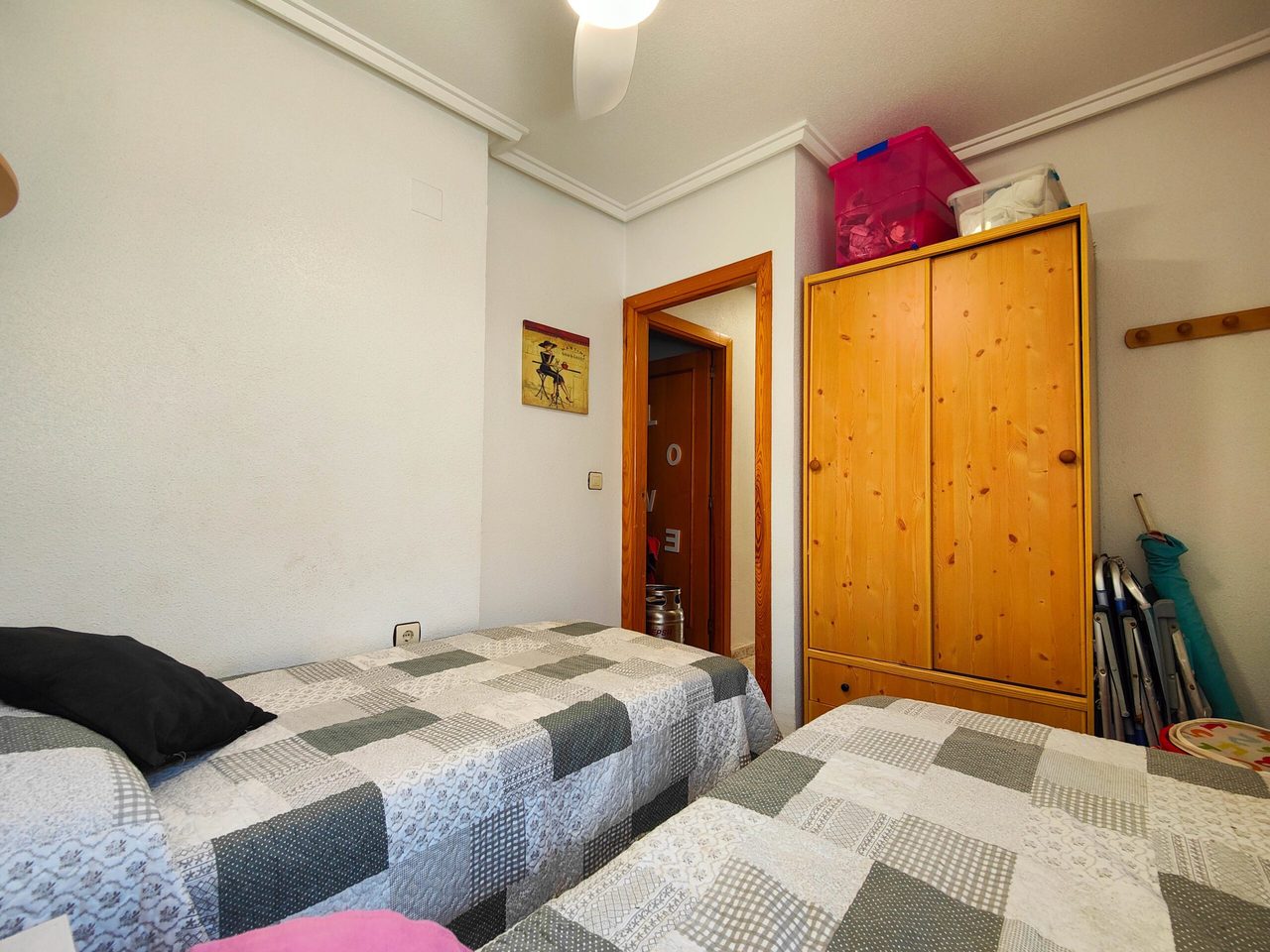 Bovenwoning te koop bij het C.C. Habaneras en de Carrefour in Torrevieja. De woning heeft een woonkamer met eethoek en een geïntegreerde keuken, 3 slaapkamers en een badkamer. Voorin ligt een zonnig oost gericht terras met vrij uitzicht op het gemeenschappelijk zwembad. Helemaal boven ligt een dakterras met bergruimte. De woonwijk heeft een gemeenschappelijk zwembad in een mooie tuin, speeltuintje voor de allerkleinsten en verschillende sportvelden. Ideale locatie aan de voet van allerlei voorzieningen zoals de Carrefour, het Habaneras Shopping Center, restaurants, apotheek, bioscopen, scholen … In de buurt ligt ook een natuurpark met wandelpaden. Deze zone ligt op 3km van de beste stranden zoals La Mata, Punta Prima, Torrevieja … Prachtige ligging aan de bekende zoutmeren van Torrevieja. Volgens een onderzoek naar de gezondste klimaten op deze aarde is gebleken dat dit Torrevieja is aan de Costa Blanca Zuid. De zoutmeren hebben een gunstig effect op de gezondheid van de mens, dus het inademen van deze zoute lucht schijnt bijzonder goed te zijn. De zon schijnt er 320 dagen per jaar en daarom is het uitermate geschikt om te overwinteren.