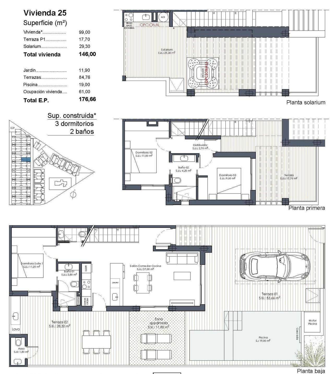 Nieuwbouwwoningen met privézwembad bij Serena Golf-Los Alcazares Boutique collectie van moderne woningen vlakbij de zee Ontdek een exclusief boutique project van 37 moderne vier- en twee-onder-een-kapwoningen gelegen bij La Serena Golf in Los Alcazares aan de prachtige Costa Calida. Deze moderne woningen zijn ontworpen voor kopers die op zoek zijn naar privacy, zon en een buitenleven op slechts 300 meter van het warme water van de Mar Menor. Los Alcazares is een charmant kustplaatsje dat bekend staat om zijn lange boulevard, zandstranden en ontspannen mediterrane sfeer. Het gebied geniet van meer dan 300 dagen zon per jaar en biedt uitstekende restaurants, winkels, jachthavens en sportfaciliteiten. De ligging tussen de zee en de golfbaan maakt het tot een van de meest gewilde bestemmingen in de regio voor zowel permanente woningen als vakantiehuizen. Moderne villa’s met privézwembad en buitenleven Elke woning beschikt over een eigen perceel met een privézwembad, waardoor het hele jaar door kan worden genoten van het mediterrane klimaat. De woningen hebben 3 slaapkamers en 2 of 3 badkamers plus gastentoiletten, waardoor ze comfortabele en functionele leefruimtes bieden die ideaal zijn voor gezinnen of gasten. De villa’s zijn ontworpen om het buitenleven te benadrukken. Naast het zwembad is er een barbecueplaats en een gastentoilet buiten, perfect voor het ontvangen van vrienden en familie. Het solarium op het dak biedt extra ruimte om te ontspannen in de zon en is voorzien van een zonnedouche met voorinstallatie voor een jacuzzi en een zomerkeuken. Parkeren is inbegrepen, zowel op het privéterrein als in een toegewezen ondergrondse parkeerplaats. Hoogwaardige afwerking en moderne voorzieningen De woningen zijn gebouwd met moderne materialen en hoogwaardige specificaties, ontworpen voor comfort en stijl. Volledig uitgeruste keuken met apparatuur in witte glazen afwerking Badkamers met verlichte spiegels, doucheschermen en wastafels Gemotoriseerde rolluiken Basisverlichtingspakket Volledig geïnstalleerde airconditioning Deze voorzieningen zorgen voor een comfortabele woonervaring, of de woning nu als hoofdverblijfplaats of als vakantiehuis wordt gebruikt. Resortachtige voorzieningen en uitstekende locatie Eigenaren hebben ook toegang tot gedeelde resortachtige faciliteiten met een naburig project. Deze voorzieningen omvatten aangelegde tuinen, een gemeenschappelijk zwembad in lagunestijl, een spa, een fitnessruimte en een sauna. De locatie biedt gemakkelijke toegang tot stranden, golfbanen en nabijgelegen steden. Mar Menor-strand 0,3 km La Serena Golf naast het project Centrum van Los Alcazares 2 km Cartagena 22 km Murcia 40 km Internationale luchthaven van Murcia 30 km Luchthaven Alicante Elche 90 km Het ondiepe water van de Mar Menor is het hele jaar door perfect om te zwemmen, zeilen, paddleboarden en andere watersporten te beoefenen. Verzeker uzelf van een mediterrane levensstijl in Los Alcazares Deze nieuwbouvvilla’s bieden de perfecte combinatie van strand, golf en modern comfort aan de Costa Calida. Neem vandaag nog contact met ons op voor meer informatie of om een bezichtiging te regelen en verzeker uzelf van uw nieuwe woning bij Serena Golf in Los Alcazares.